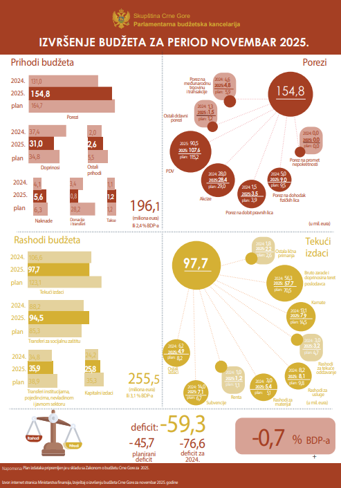 Извршење буџета Црне Горе за период јануар новембар и новембар 2025. године